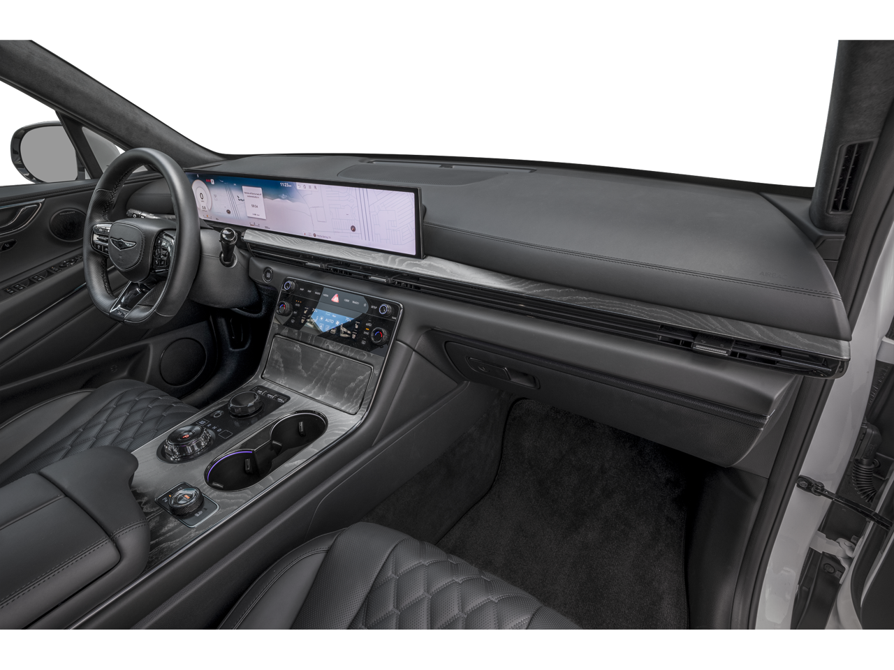 - Radio: AM/FM/HD Bang & Olufsen Premium Audio -inc: 18 speakers, 14-channel amplifier w/1,400 watts max output, 27" integrated OLED screen and navigation system, SiriusXM Radio w/90-day trial subscription (not available in AK or HI), wireless Apple CarPlay and Android Auto, Genesis connected services, Bluetooth® hands-free phone and audio streaming system, Wi-Fi hotspot and USB connectivity